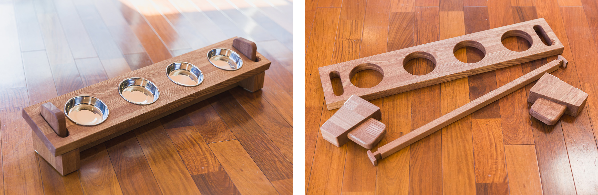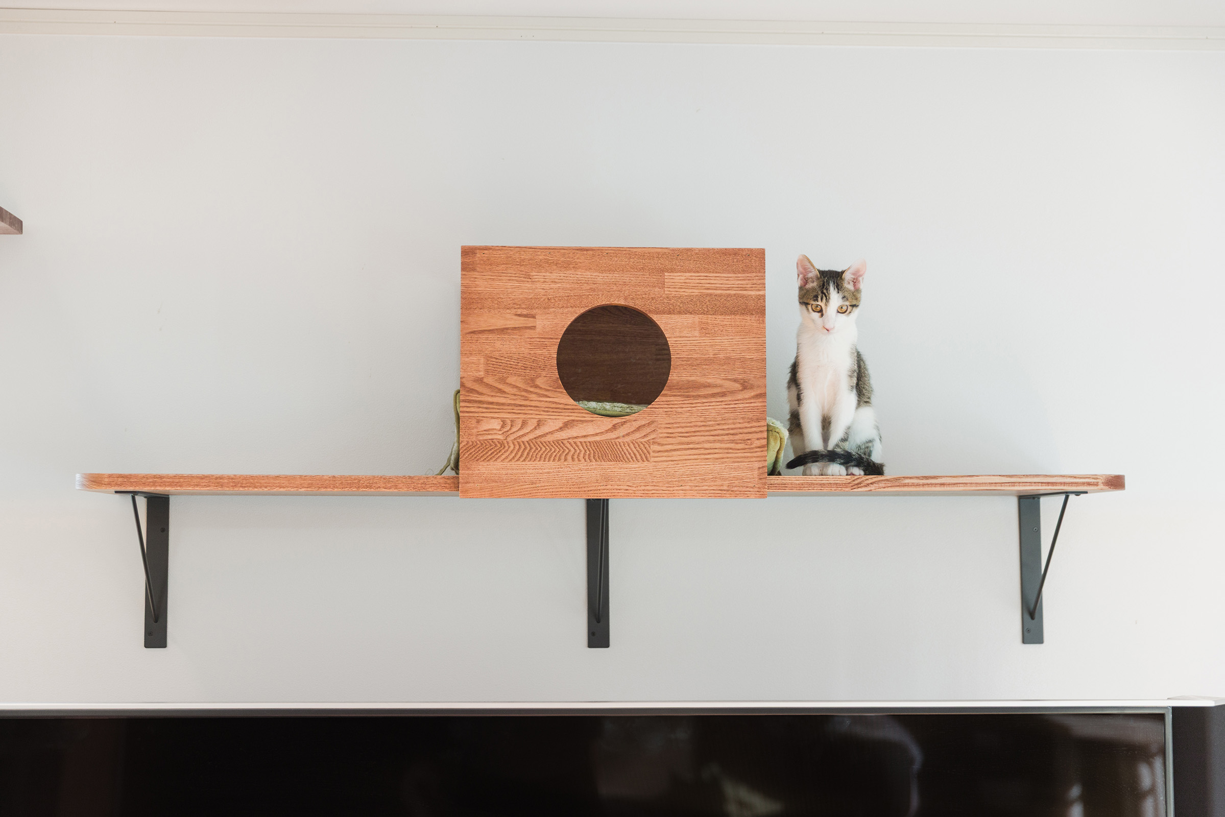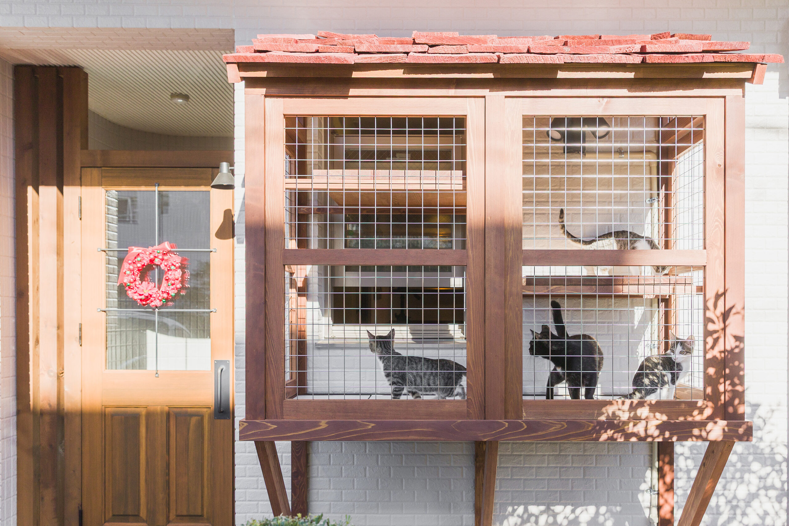 保護されているねこちゃんたちが、新しい飼い主さんと出会うまで仲間たちと楽しく暮らせるよう、キャットウォークや脱走防止玄関・ねこ専用テラス(キャティオ)など施工しました。また、こちらでご使用いただいているフードボウルスタンドは、木工職人による手作り商品です。
