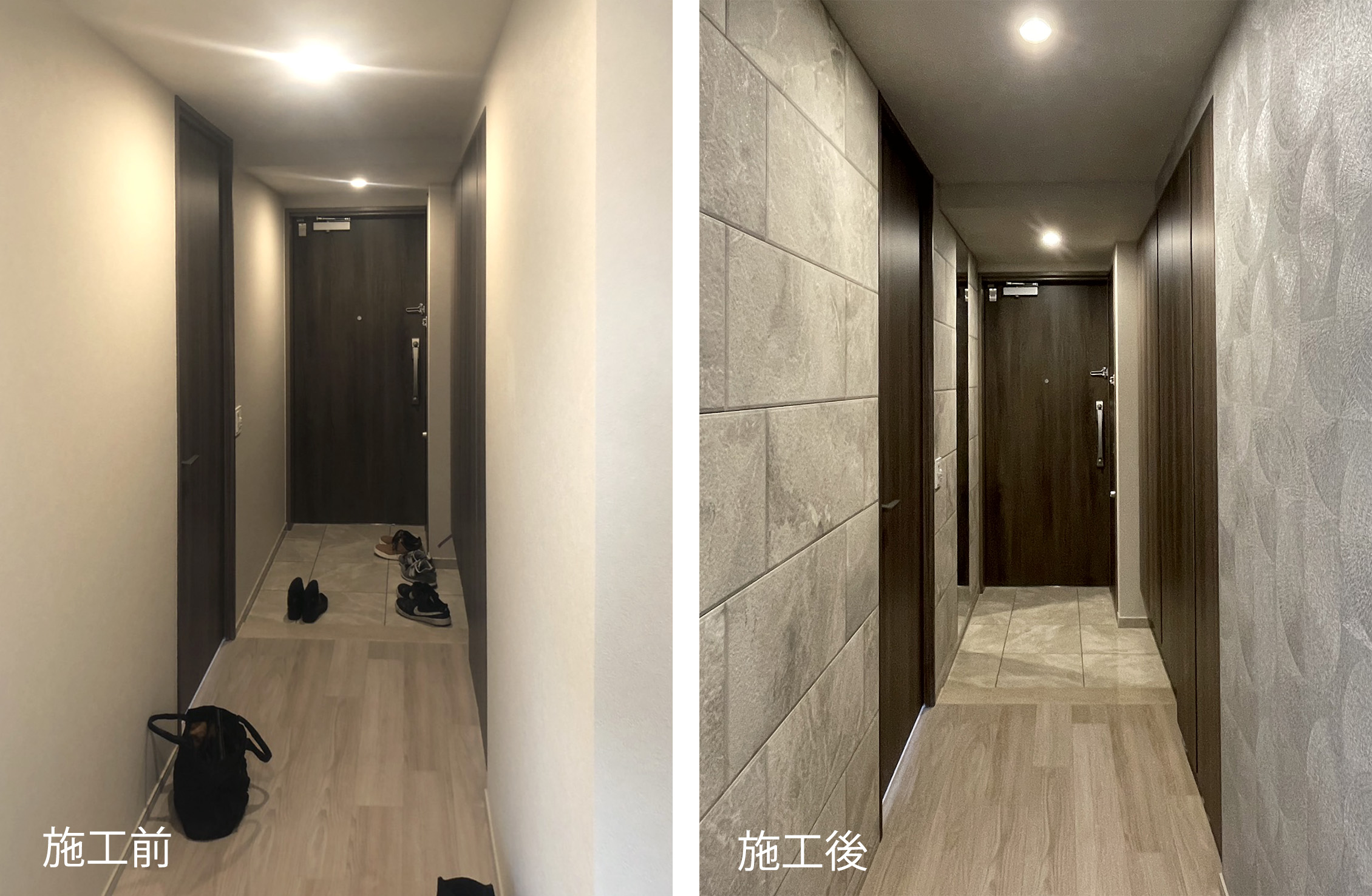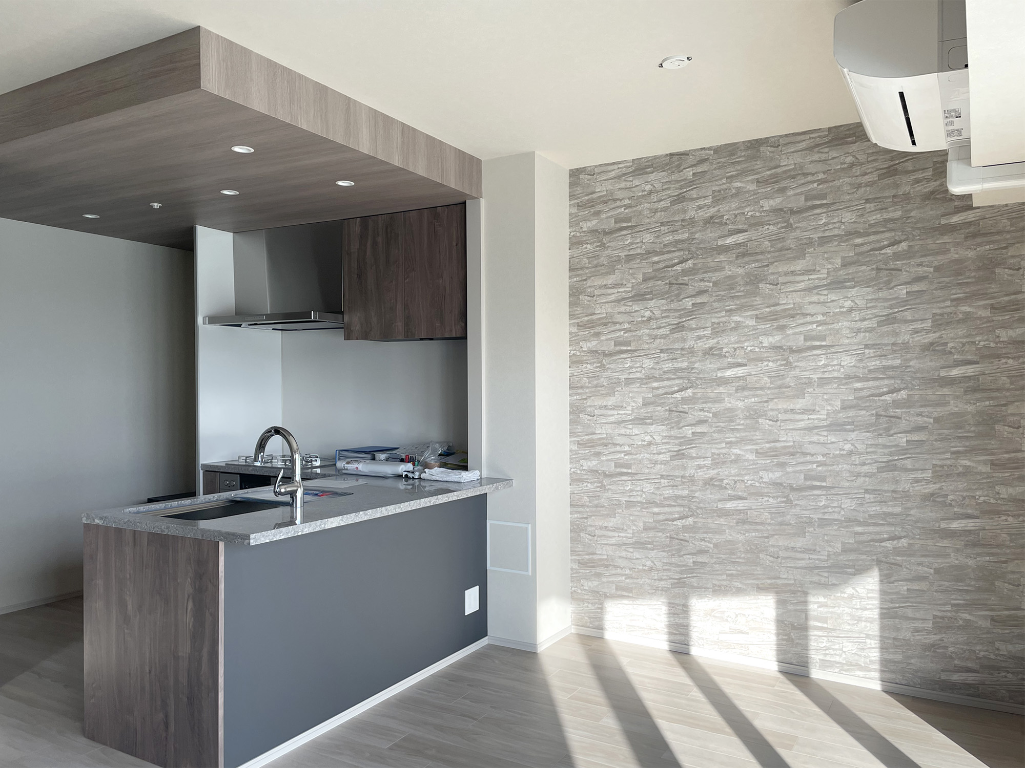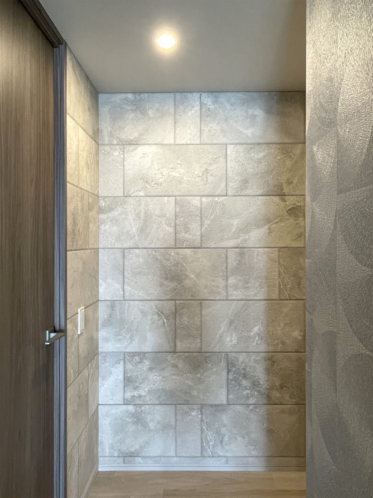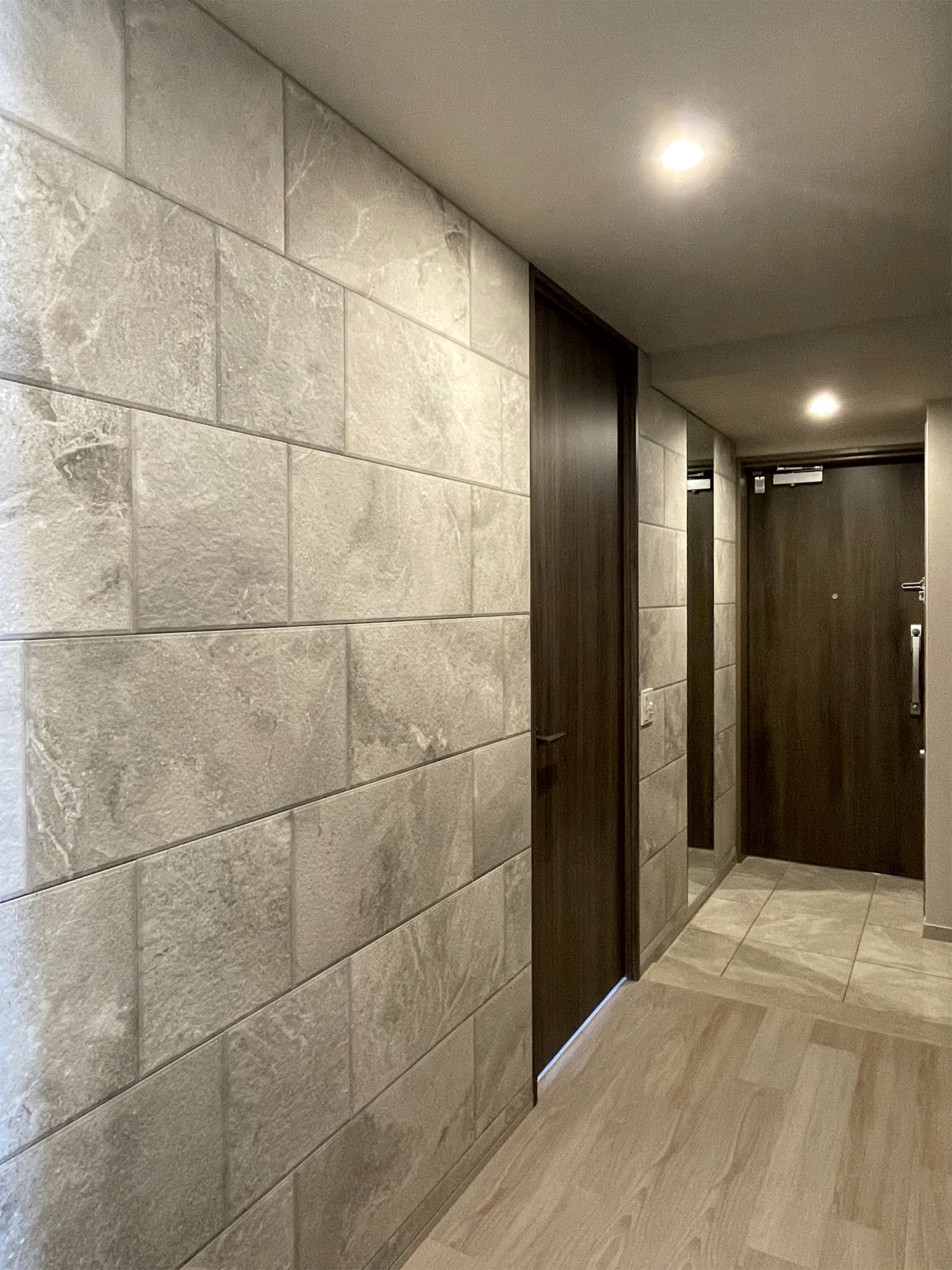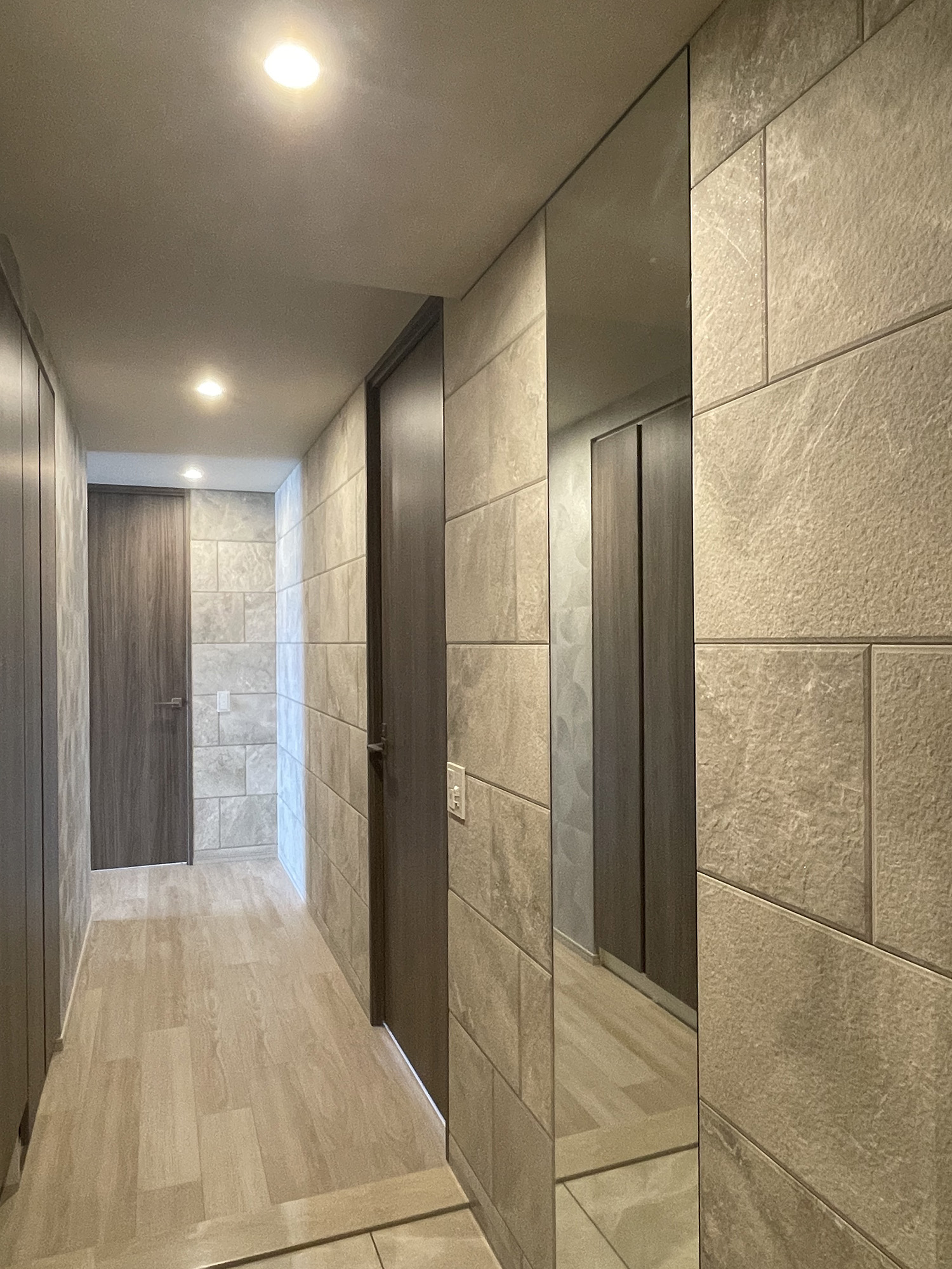 玄関に姿見、そこからリビングまでの廊下にエコカラットプラスのサンティエを施工。リビングの一面にアクセントクロス、キッチンの下がり天井部分の木目調のクロスが、白いクロスにはないおしゃれな空間を演出してくれます。LIXIL エコカラットプラス サンティエ